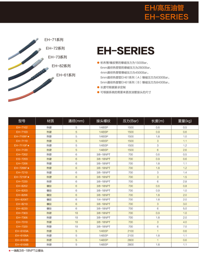 5mm通徑熱塑管EH61系列(B)爆破壓力為8400Bar